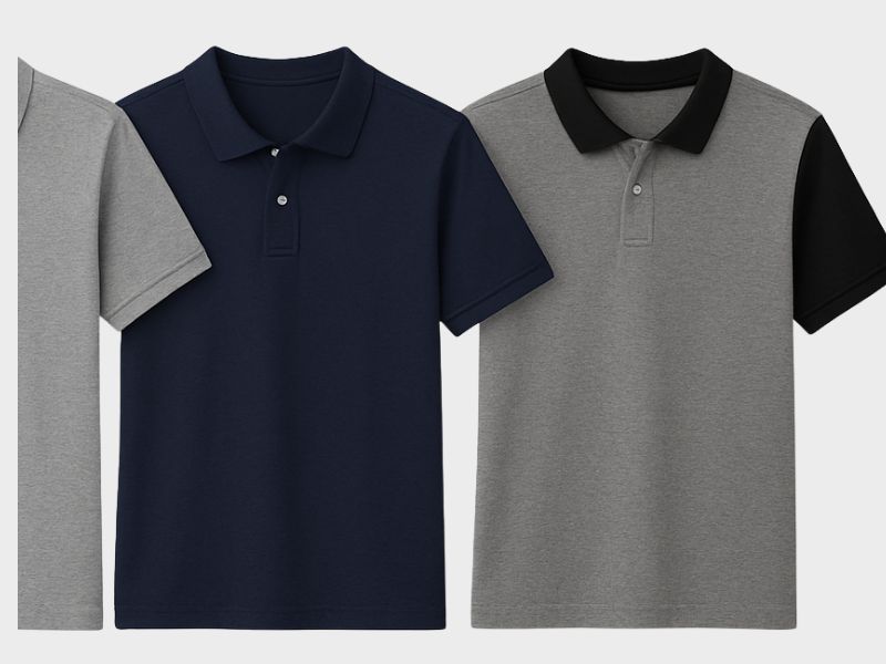 Chombas de algodón en colores lisos y combinados, mangas cortas.