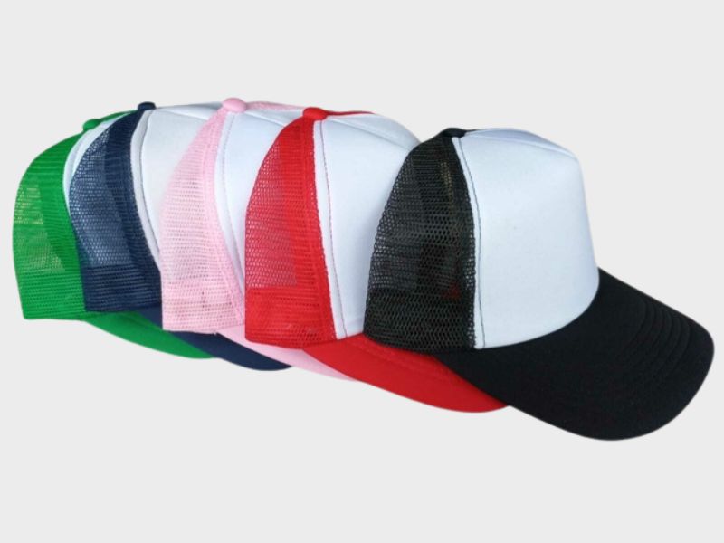 Gorra trucker en varios colores, lista para sublimar con tu diseño personalizado.